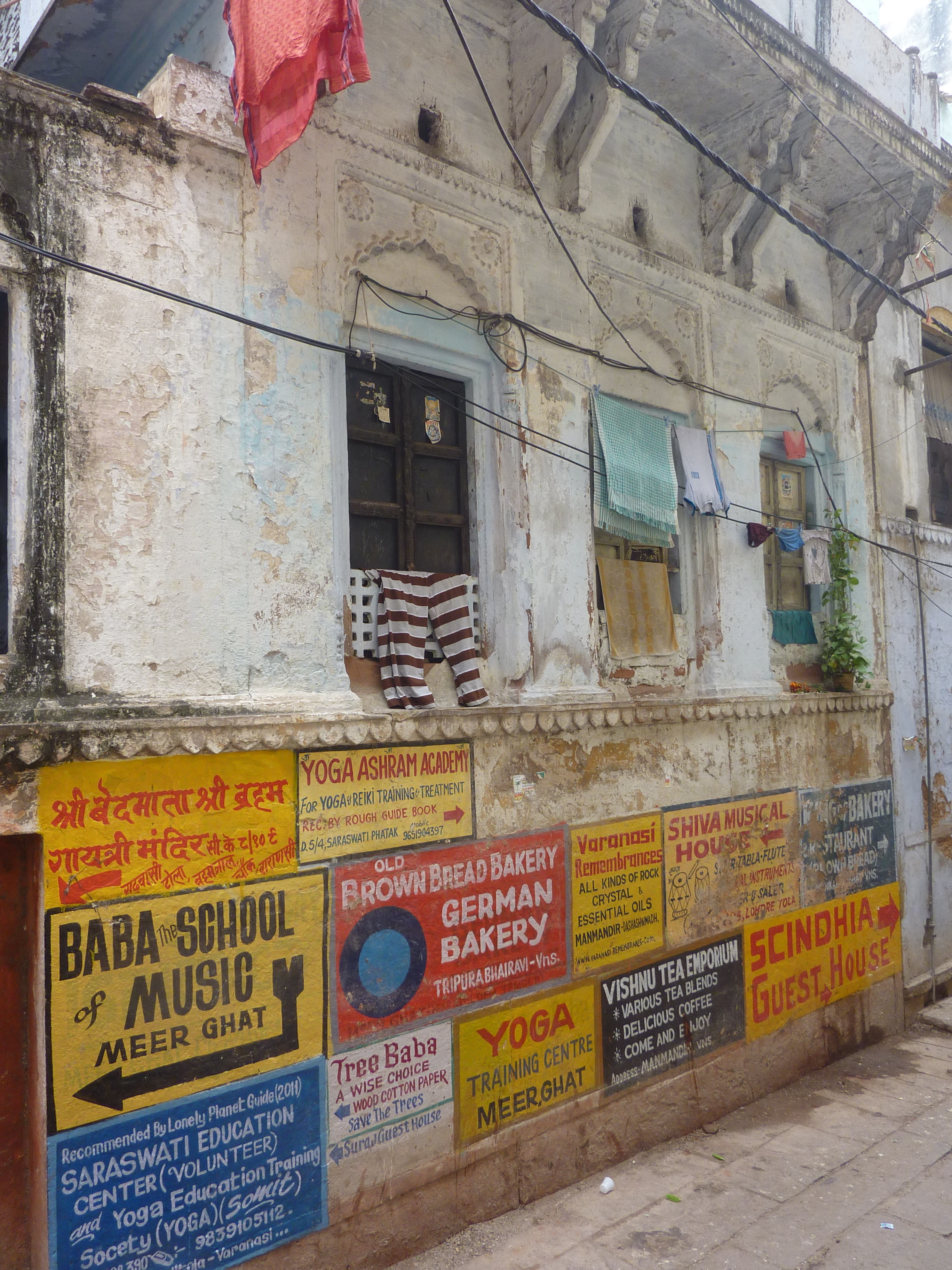 I arrived in Varanasi after a very long train ride from Kolkata at around 10 in the evening where I was greeted by both a blackout (not uncommon) and some sort of religious festival (also not uncommon). Luckily I’d emailed my guesthouse with arrival details and they had sent a rickshaw driver to the station for me as finding it on my own would have been nearly impossible. The Old City is a maze of ancient buildings in which addresses and street names seem to be virtually non-existent. The best you can hope for in that regard are the many colorful hand painted signs on the walls that seek to point you in the direction of some of the more enterprising restaurants, hotels, yoga studios and music shops in the area.