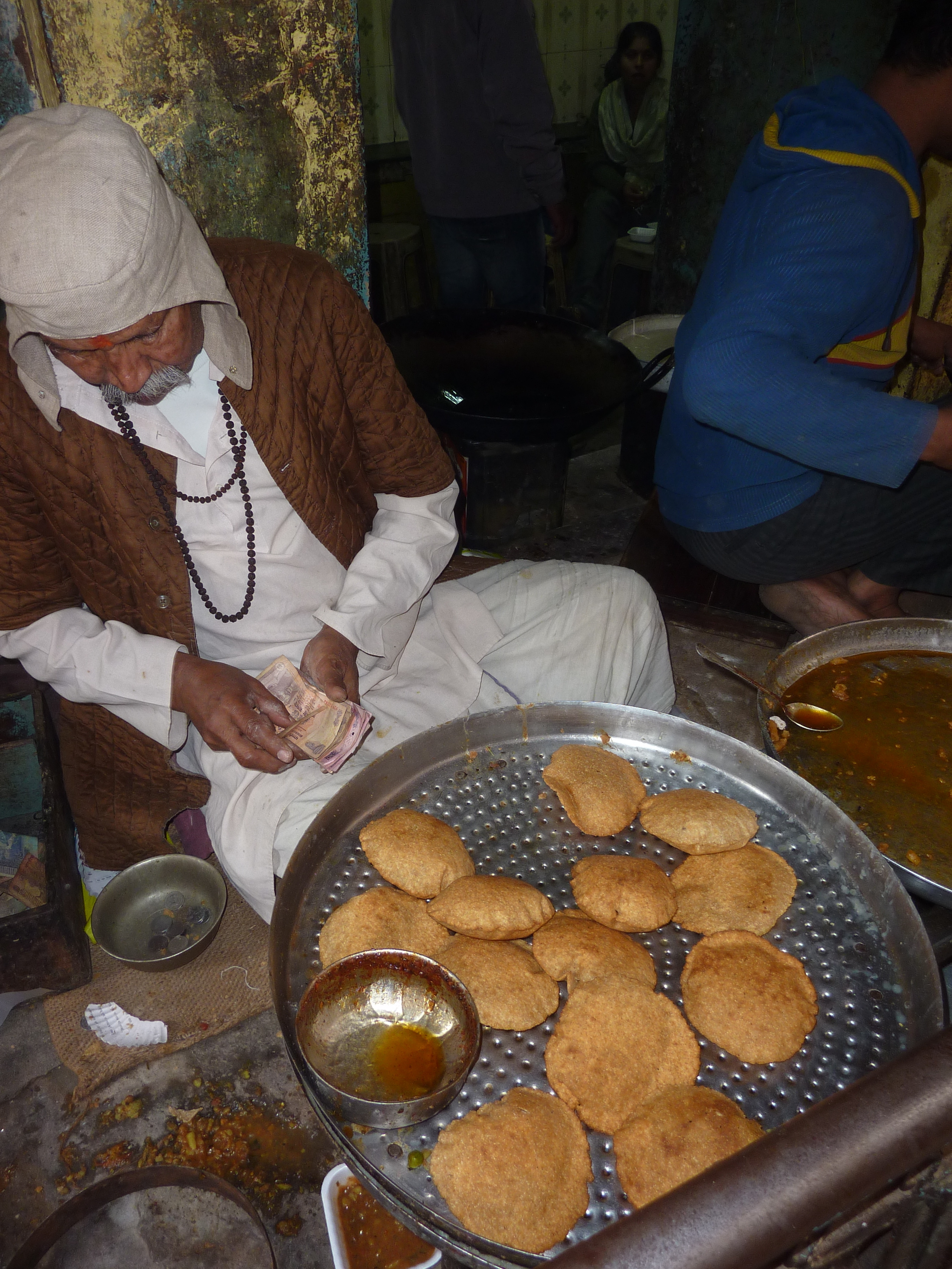 My guesthouse had a few dudes hanging around who kind of worked there if you consider sitting around drinking chai to qualify as work and I do since it isn’t much different than many of my workdays which often consisted of sitting around an office drinking coffee while reading the interwebs and doing about .5 hours of actual legal work. But they mostly freelanced as guides. While I usually steered clear of guides on my trip, I made an exception in Varanasi after having a long and engaging chat with one such chap on the morning of my first day in town. It turned out to be a good call. We spent parts of two days wandering around town together and I definitely ended up in several very interesting places I probably wouldn’t have been able to find on my own and several other interesting places I wouldn’t even have known to have tried to find. We had a quick delicious breakfast of chai and some sort of fried thing at the hole in the wall (almost literally) where he eats most mornings…