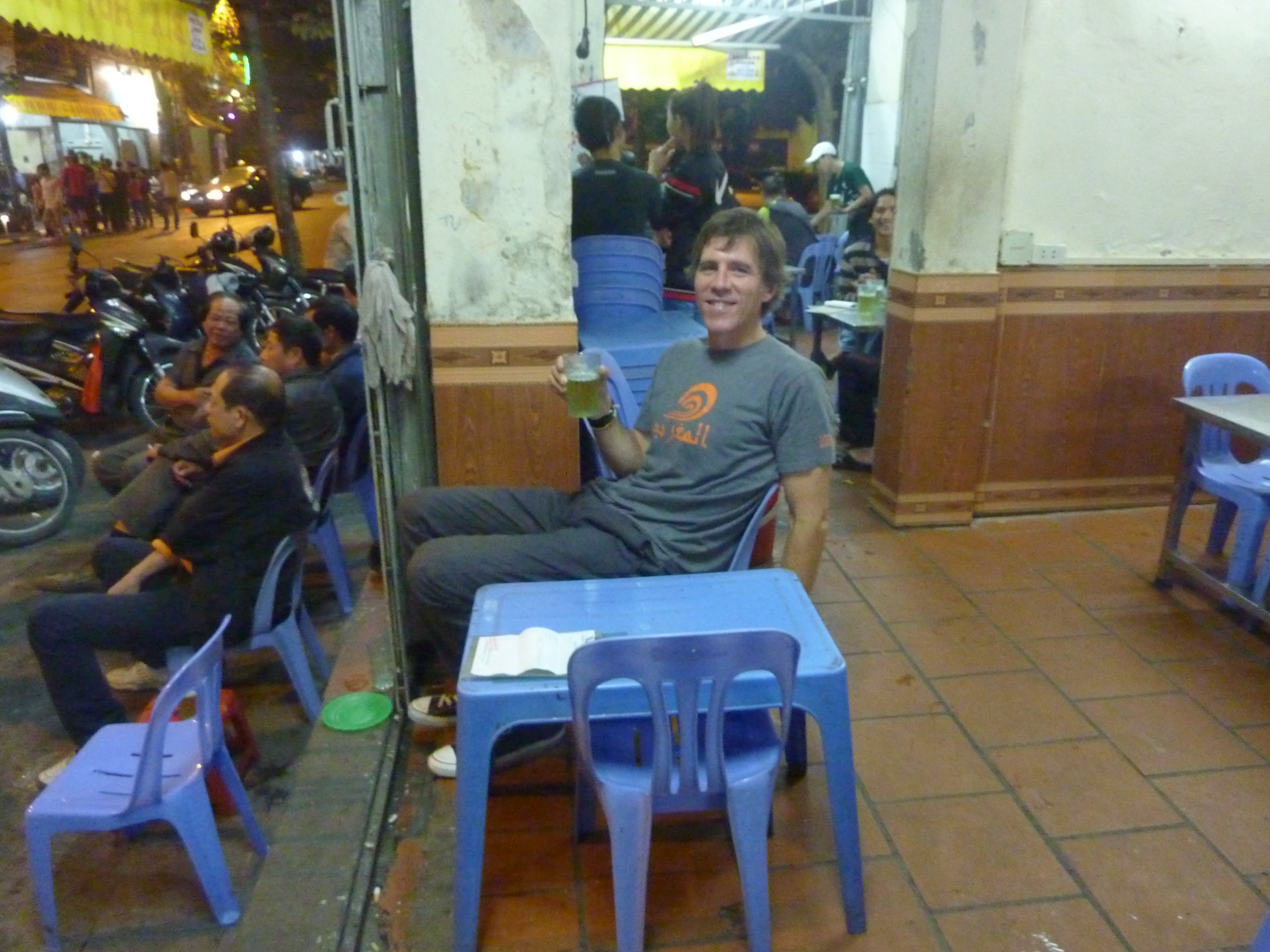 So what then is a bia hoi joint? Picture an open faced and airy two or three walled establishment with bad lighting, a big awning and some sort of fiercely spill resistant flooring (e.g. concrete). It’s sparsely furnished with tiny plastic tables and even tinier plastic stools that spill out onto the sidewalk and, in some cases, into the street. They seem to be clustered together (at least they were in Hanoi) and located on street corners making them optimal for watching life pass you by in the busy streets. Waitresses serve an overwhelmingly male clientele cold glasses of bia hoi which that clientele eagerly consumes while pairing them with tasty Vietnamese bar snacks and boisterous conversation. I suppose they’re the Vietnamese version of the English pub or the German biergarten and they’re awesome. Here’s me enjoying the awesomeness…