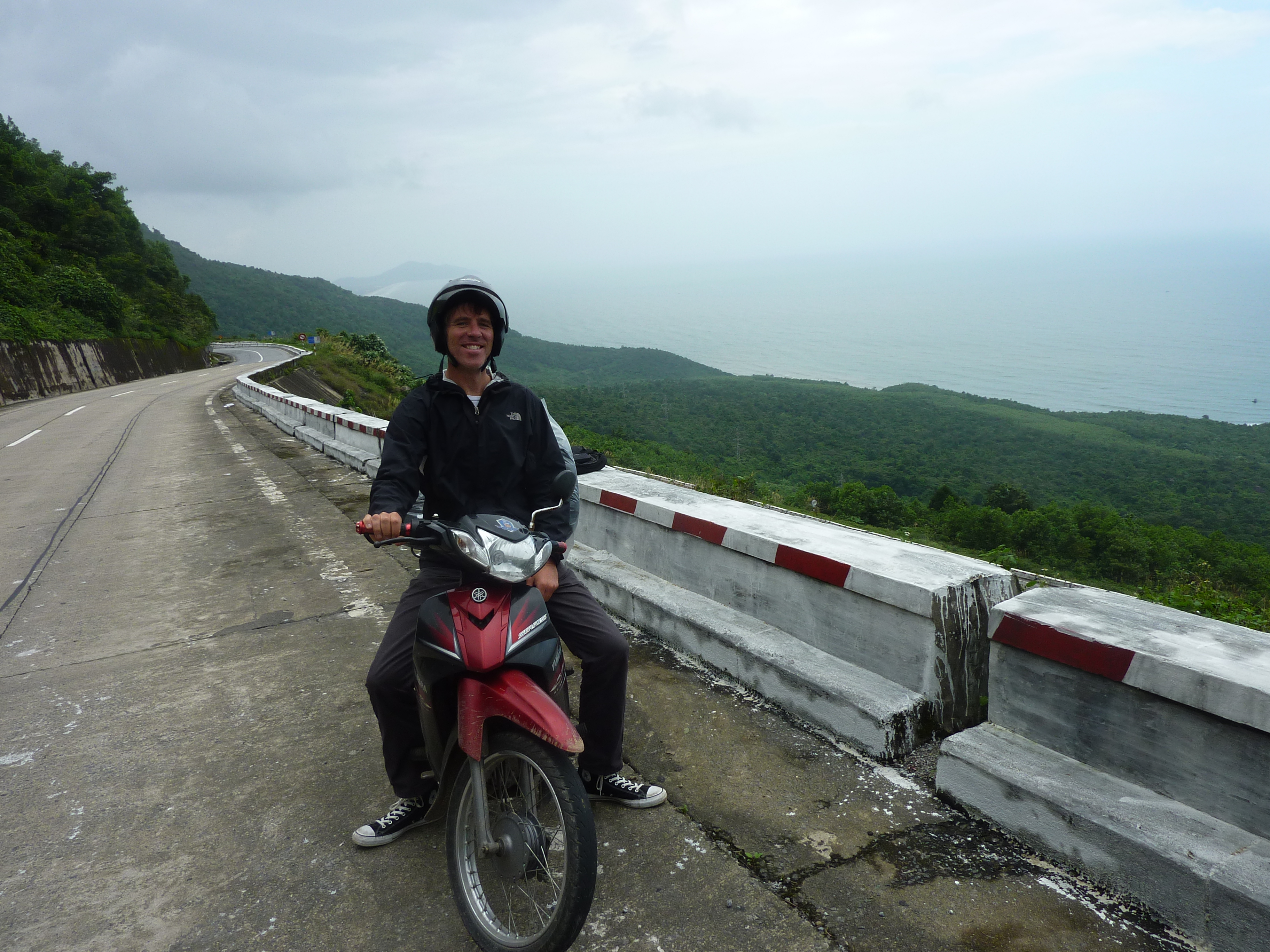 I did the roughly 100 kilometer trip from Hue to Hoi An on an underpowered 125 cc motorbike in on again off again rain with a guide rather than making the short trip via train. The motorbike had the advantage of going up and over a somewhat interesting pass that probably has much better views on sunny days whereas the train sticks to sea level. It also meant a stop off to check out China Beach. I’m guessing that too is probably cooler on a sunny day but it was good to see nonetheless. Punchy waves. Unfortunately it also meant stops at a crappy waterfall with a vaguely elephantine rock and a really touristy marble-carving ghetto. Here’s me on my steel horse somewhere up on the pass…