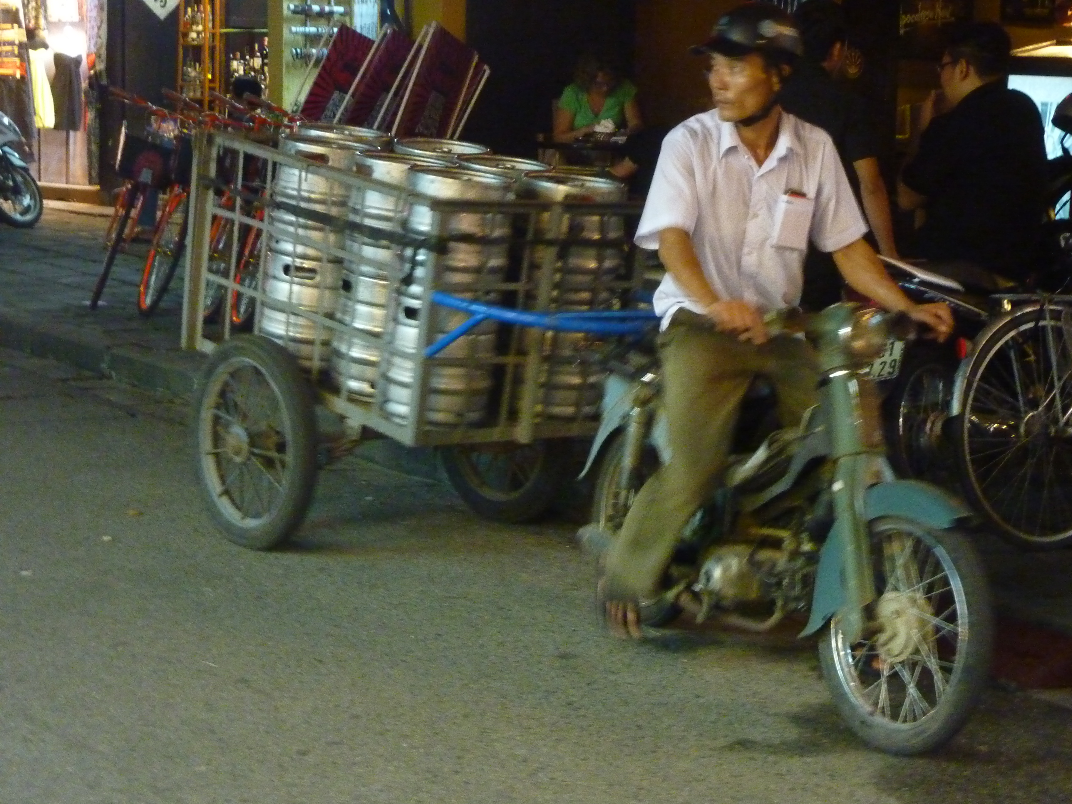 In the evenings I’d migrate from the sidewalk cafes to the bia hoi joints to further pursue my people watching and beverage drinking. What’s bia hoi? It’s freshly brewed beer. No preservatives. Crisper and cleaner and lighter than any beer I’ve ever tasted. It seems to have a lower than normal alcohol content too which means you can suck down quite a few in an evening without feeling any ill effects the following morning. It’s delivered daily to those watering holes wise enough to sell it by dudes like this…
