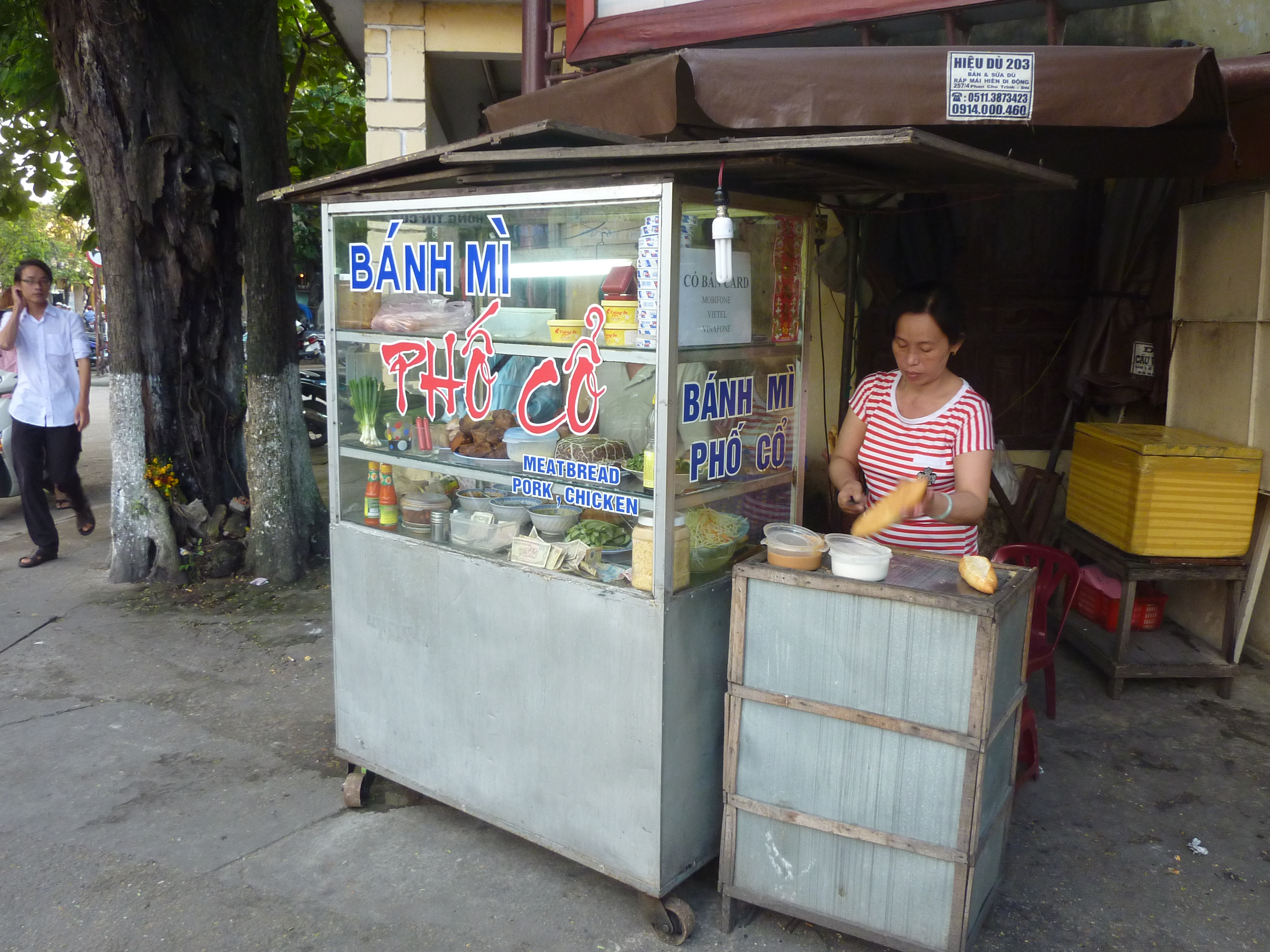 I also had the best banh mi of my trip in Hoi An. For those unlucky enough to be unfamiliar with the glorious banh mi, it’s constructed on a special baguette made from a mixture of rice flour and wheat flour which is then stuffed with any number of ingredients. In my experience with the better banh mis those ingredients tend to be roasted pork, pate, cucumber slices, cilantro, pickled carrots, daikon and hot sauce. They’re cheap and easy to eat while milling about near the stand or on the go. They’re kind of like the tacos of Vietnam. My preferred stand in Hoi An…