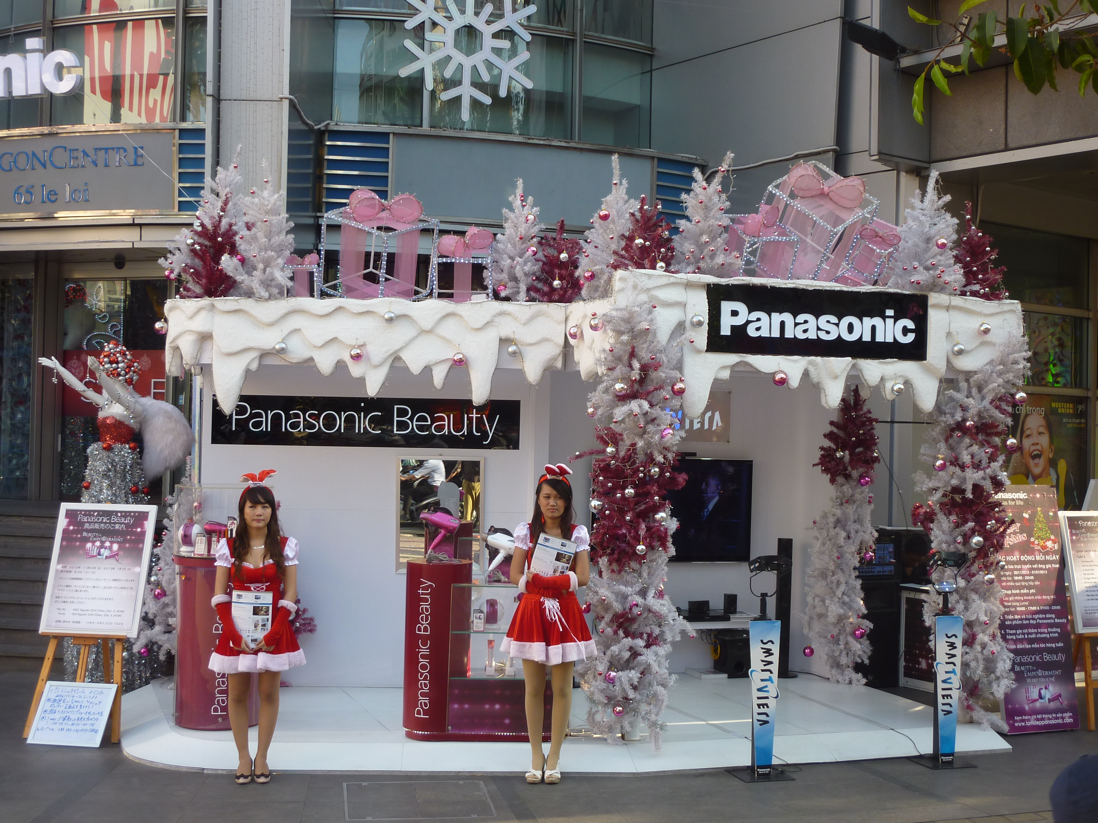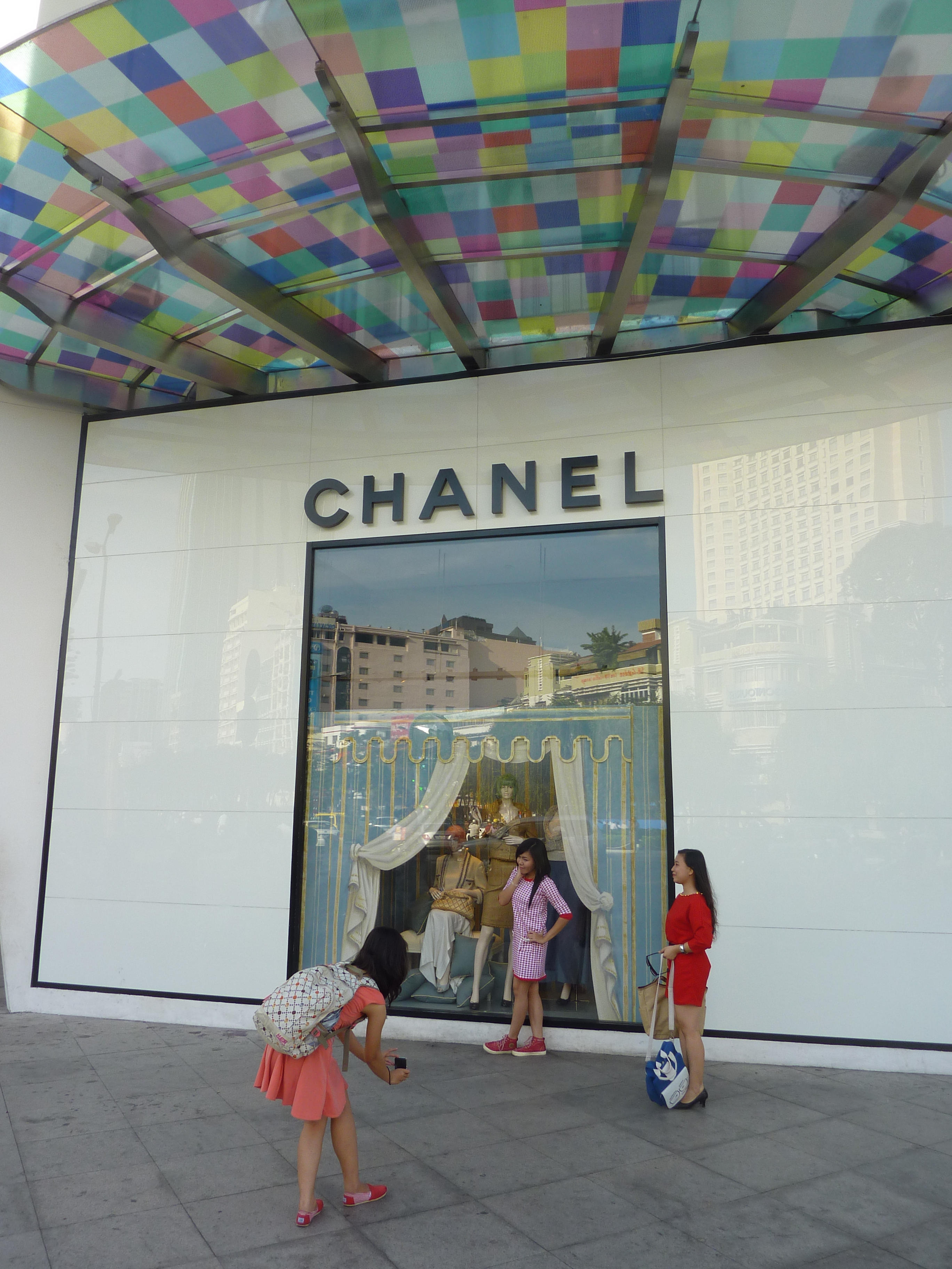 And those girls weren’t the only ones rocking festive attire as I saw young children everywhere sporting mini-Santa outfits which I guess is what happens when the Vietnamese put their own little spin on Xmas. There were other variations as well, the most striking of which to me was the taking of tons and tons of pictures while posed in front of high-end boutiques tricked out with holiday decorations. Most of the shutterbugs were parents shooting their children and teens shooting other teens. Many storefronts were mobbed with picture takers as they jockeyed to have their photos taken in front of display windows containing the latest in unnecessary consumer products. And the more expensive the products on offer in a given shop, apparently the more desirable it is as a photo backdrop.