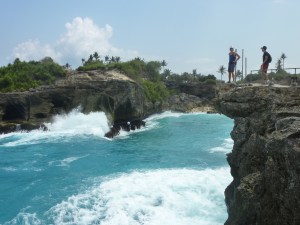 We didn’t just surf on Lembongan. We did some top notch snorkeling around the backside of the island near a mangrove forest. As Ronnie observed, islands that offer both solid surf and snorkeling/diving pretty much rule. Another day we rented motorbikes from the very cool bartenders/waiters at our hotel and raced around the back roads of Lembongan and the smaller neighboring island of Ceningan which is adjoined to Lembongan by rickety suspension bridge. One of our intended objectives on Ceningan was to partake in a little cliff diving. A dude claiming to be named Barack Obama maintains a cool little restaurant with a 13 meter high jump point. Unfortunately the waves were simply too heavy that day and thus he had the point closed to jumping. And if they think something is too dangerous in Indonesia, you better believe it is.