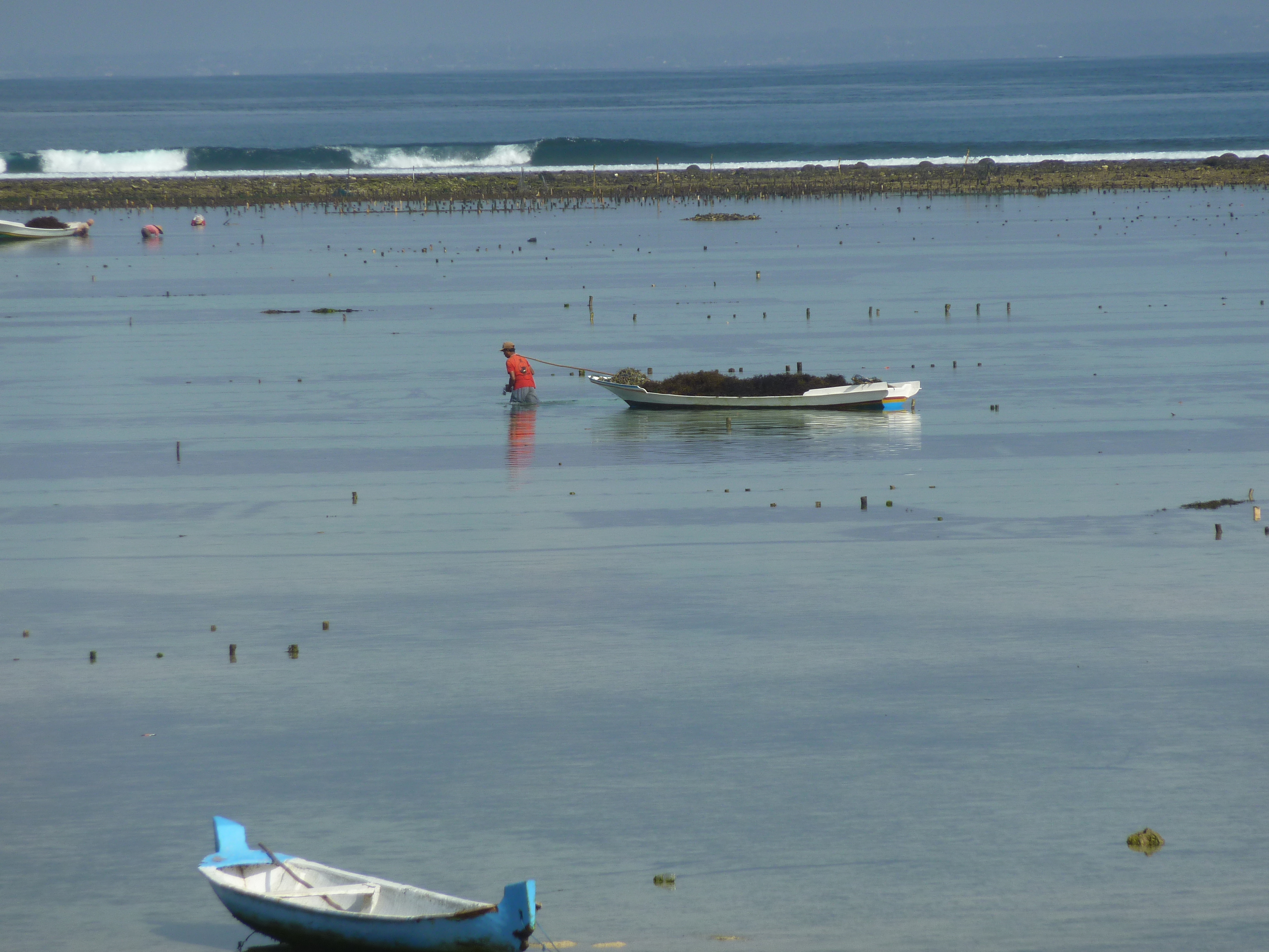 The bay in front of Jungutbatu is mostly fringed by an outer reef and thus the waters are very calm within the bay which apparently helps in making it ideal for seaweed farming. I’d never seen plots of seaweed being cultivated like this and I’d never seen seaweed farmers at work. It was fascinating. There was something hypnotic about watching the farmers go about tending their crops and slowly steering their seaweed laden skiffs around the harbor using long bamboo poles to propel and steer the boats. Who knew that drinking Bintang and watching seaweed farming could be such a meditative experience?