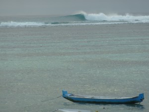 On our first go out in Lembongan, we tackled a break called Shipwrecks, so named because there used to be a rusting skeleton of a wrecked ship lodged on the reef within throwing distance of the take off zone. Actually it would probably be more accurate to say that it tackled us. It’s a right hander with not too critical of a take off depending upon where along the reef you are sitting. As the wave runs down the reef it picks up speed and thus you have to have your foot on the gas from the get go if you want to make it down the line and into the potential barrel section. If you surf a wave there as intended, you’ll kick out into a bit of a channel. If you blow it on the first wave of a decent sized set, you’re probably going to end up over, on, in or dragged across the reef. You don’t want that as both Oscar and Ron ascertained within minutes of hopping off Mr Bali’s fishing boat and into the lineup. I ascertained the same shortly after their respective ascertainments.
